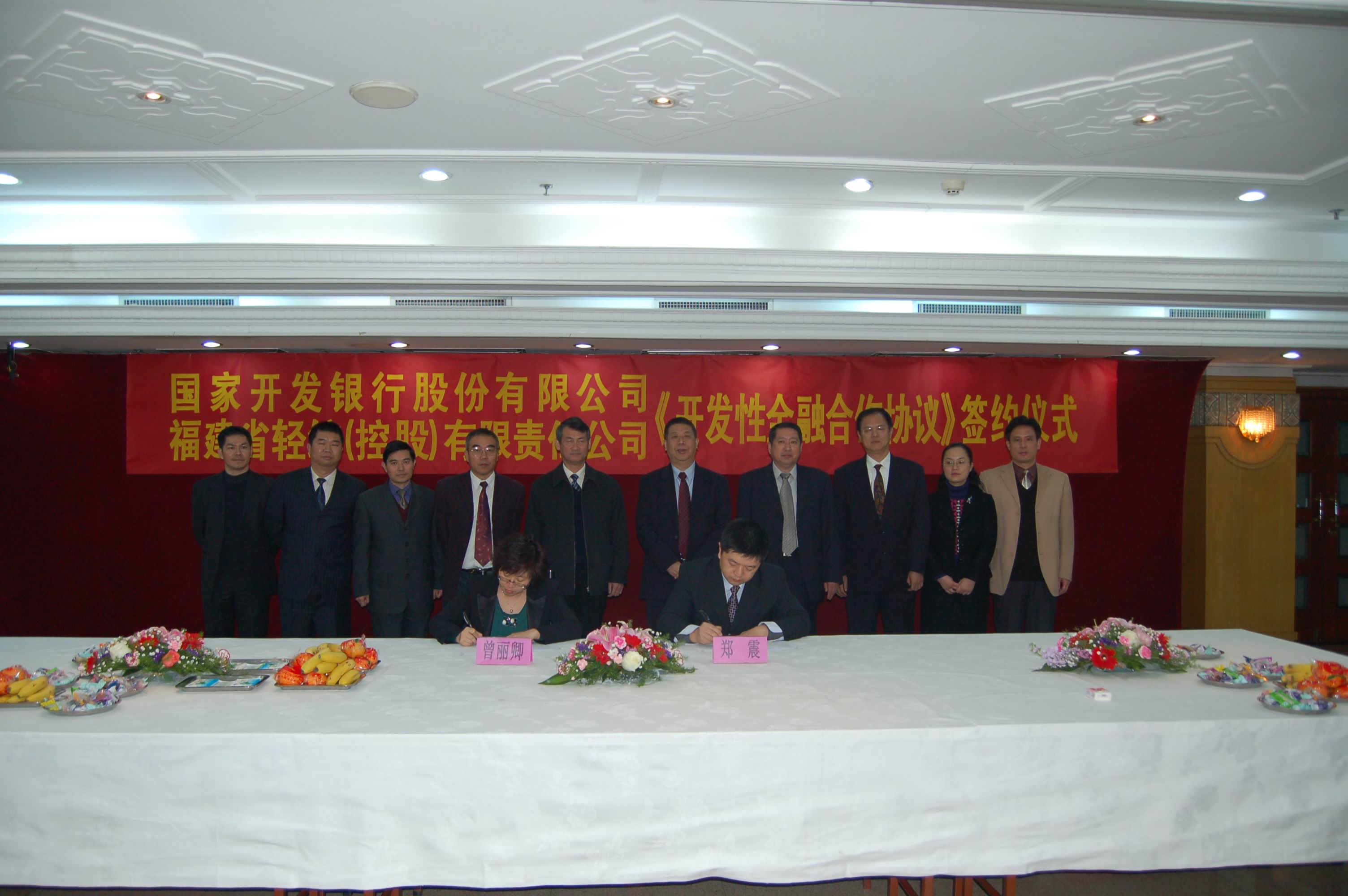 12月24日,福建省輕紡(控股)有限責任公司與國家開發銀行簽訂《開發性金融合作協議》。國家開發行福建分行行長張偉、副行長曾麗卿、福建省輕紡(控股)有限責任公司總經理鄭震、副總經理黃國英出席了出席了簽約儀式。簽約儀式由黃國英副總經理主持。