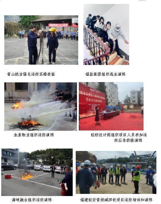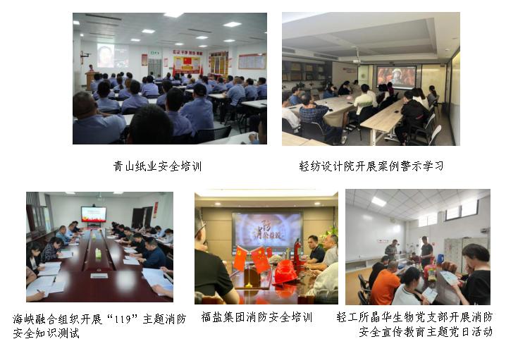 二是消防知識大學習。全系統上下組織開展消防安全知識培訓,以案為鑒強警示,敲響警鐘保安全。公司本部將消防宣傳月要求納入中心組學習,圍繞“強化安全生產責任落實 有效防范化解各類安全風險”主題開展交流研討;青山紙業邀請福州民安消防有限公司高級講師開展了11場次的消防安全拓展培訓;海峽融合組織開展“119”主題消防安全知識測試;福鹽集團、輕紡設計院、輕工所、金皇物業等組織專題培訓,傳達學習省政府、福建輕紡關于開展2023年消防宣傳月活動的通知精神及《消防法》等法律法規,組織人員觀看消防安全警示教育片和典型火災事故案例,切實增強廣大員工消防安全意識。