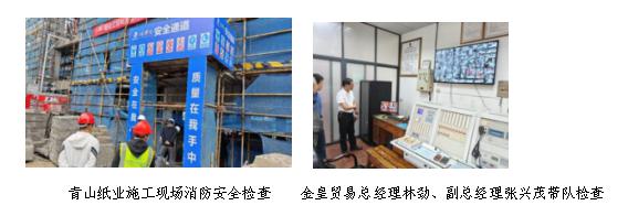 六是消防隱患大排查。進一步壓緊壓實消防安全責任,將消防宣傳月活動與鞏固深化消防安全重大風險隱患專項排查整治行動相結合,組織排查整治各類安全隱患。福建輕安組織對本部、消防重點項目(青山紙業、山東魯麗木業)進行消防隱患重點排查,持續強化全鏈條安全隱患排查整治;金皇貿易領導帶隊前往消控室、機房、停車場等消防安全重點部位,認真仔細開展安全檢查工作,及時、妥當處理潛在安全風險隱患。
