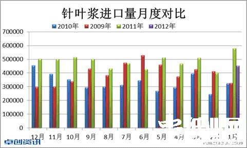 從海關數據來看,2011年我國共進口針葉漿582.49萬噸,月均進口量48.54萬噸,針葉漿總進口量遠遠超出2010年的399.18萬噸。闊葉漿進口量達525.58萬噸,月均進口量43.80萬噸,2010年全年闊葉漿進口量為441.56萬噸。木漿進口量大幅增多,加之去年造紙行情低迷,消息稱截至上月,國內木漿庫存量高達200萬噸左右。同時自去年11月份開始,木漿訂貨量大增,因此3月份到港量預計有所增加,令短期木漿供應壓力增加。